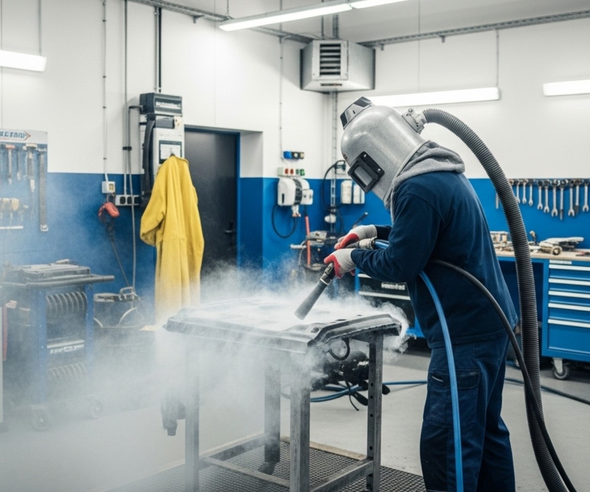 Pressurized dry ice pellets are gently applied to the surfaces needing cleaning. The pellets sublimate instantly on contact, removing dirt, grease, and residues without leaving any chemical traces